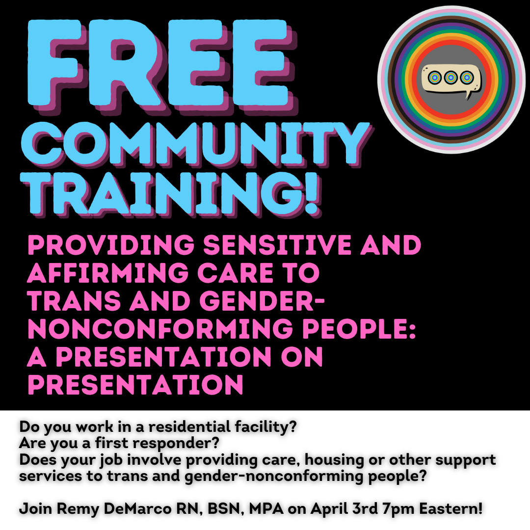 Join Remy DeMarco RN, BSN, MPA (they/them) for a Presentation on Presentation! This webinar, Providing Sensitive and Affirming Care to Trans and Gender Non-Conforming People is intended for first responders, employees at residential facilities and anyone who provides care, housing or other support to members of the TGNC community.